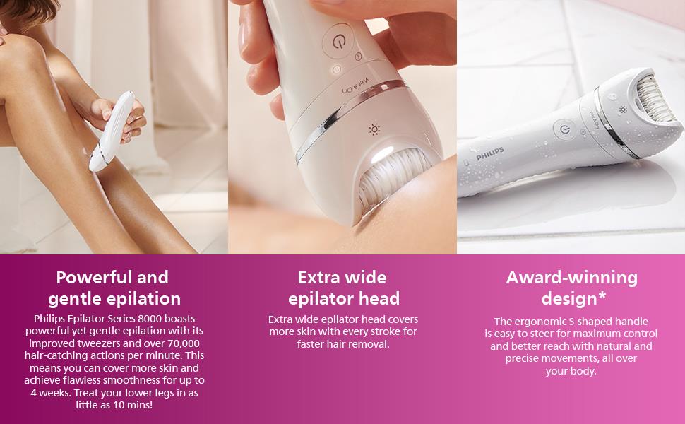 Powerful eplilation. Gentle on skin. Smooth skin for up to 4 weeks. Philips Epilator Series 8000 boasts powerful yet gentle epilation so you can achieve smoothness on your lower legs in as little as 10 minutes. Enjoy benefits beyond just epilation with a full routine set.